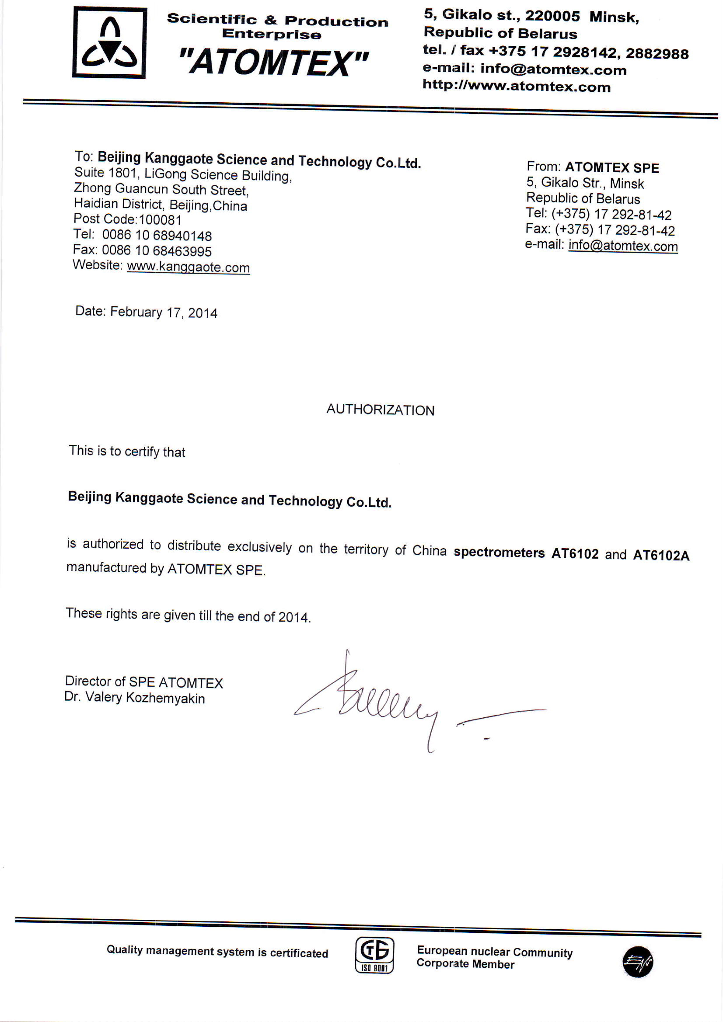 在中國,ATOMTEX授權(quán)北京康高特科技有限公司為授權(quán)代理商,主要經(jīng)營ATOMTEX旗下的個人劑量計,活度計,核輻射劑量率儀,能譜儀(即核素識別一)等全線產(chǎn)品,其中北京康高特科技有限公司是AT6102的中國唯一代理商。